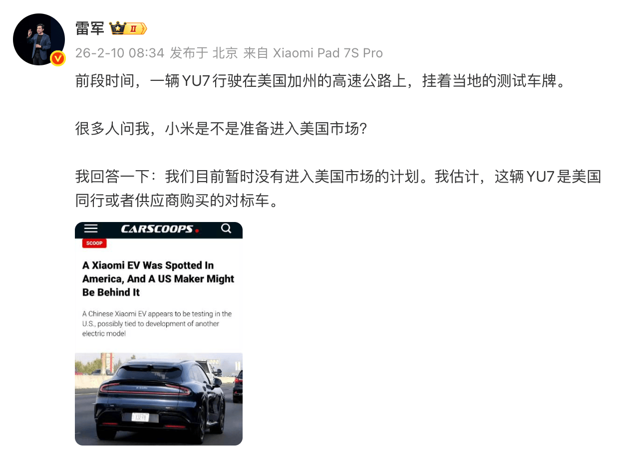 昨日,小米创办人雷军回应了近期「小米 YU7 在美国加州测试」的相关消息。