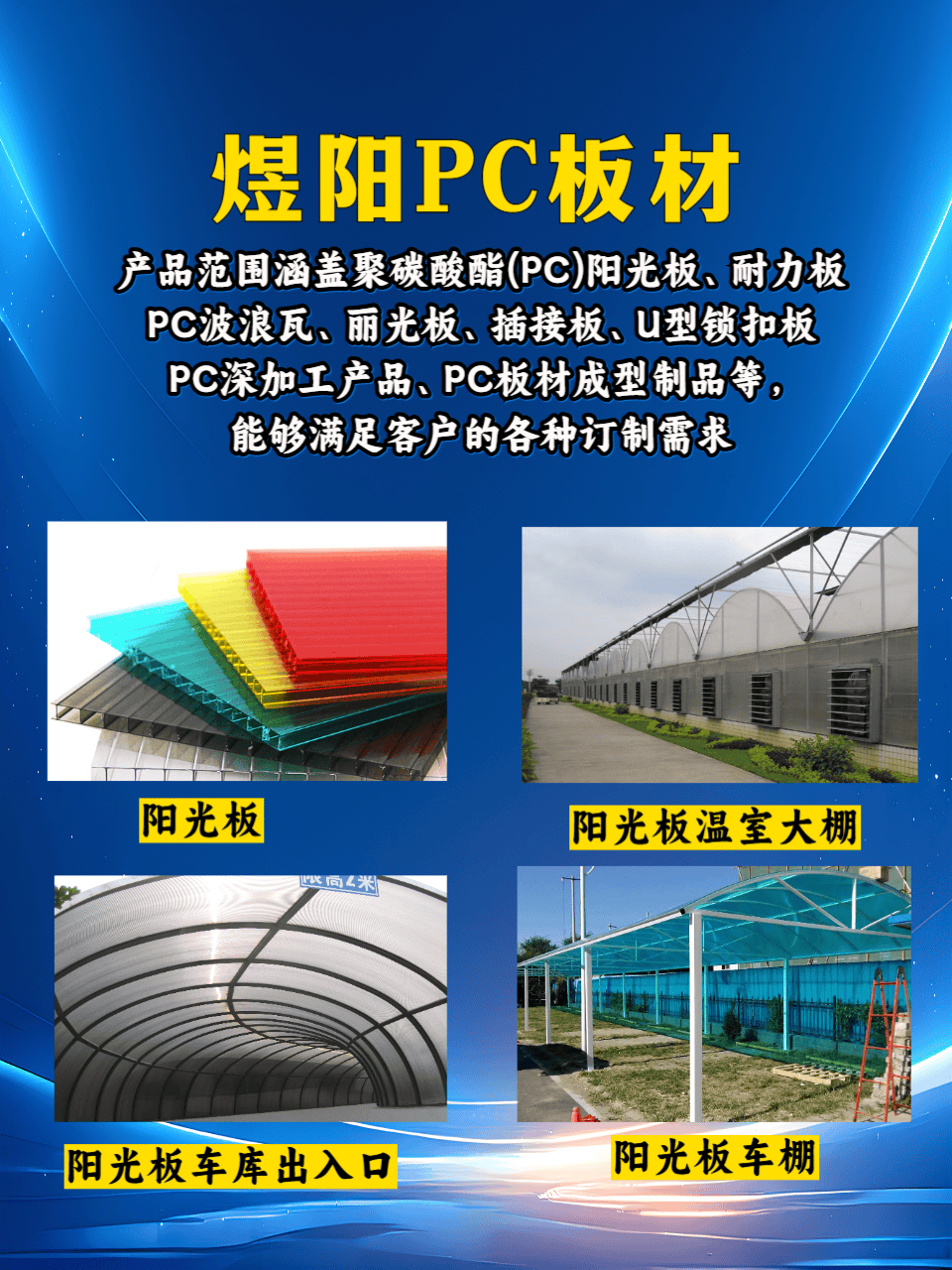 煜阳建材科技(天津)有限公司作为行业内的技术驱动型企业,始终专注于聚碳酸酯(PC)板材的研发与生产,其主营产品涵盖PC阳光板、PC耐力板、PC瓦板、U型锁扣板、插接板及PC板材深加工服务。其中,PC阳光板系列包括双层、三层、四层、蜂窝及米字结构,厚度从4mm至25mm不等,可满足不同场景的采光需求;PC耐力板则提供通用型、磨砂型、钻石型及荔枝型表面处理,透光率与抗冲击性能进一步优化;PC瓦板中的丽光板、角浪瓦、波浪瓦等产品,通过独特的结构设计,实现了排水效率与承载能力的平衡,广泛应用于温室大棚与车库出入口。